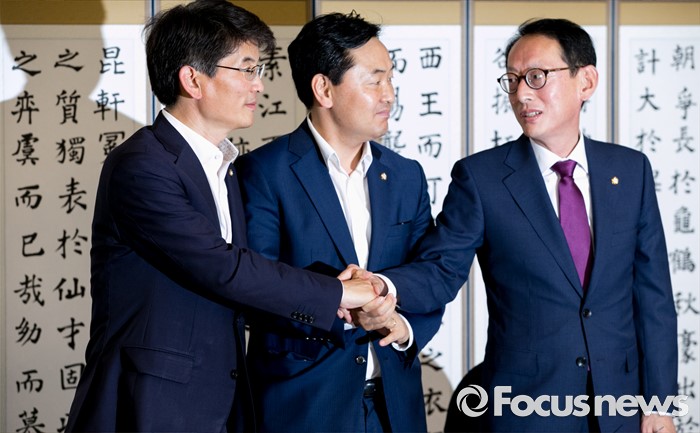 (서울=포커스뉴스) 6일 오후 서울 여의도 국회 귀빈식당에서 열린 20대 국회 원구성 협상 등을 위한 회동에 참석한 김도읍(오른쪽) 새누리당 원내수석부대표, 박완주(왼쪽) 더불어민주당 원내수석부대표, 김관영 국민의당 원내수석부대표가 취재진을 향해 포즈를 취하고 있다.