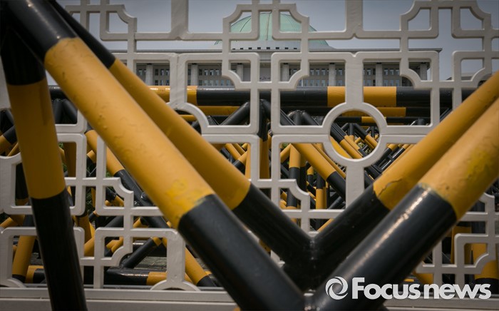 (서울=포커스뉴스) 20대 국회 원구성 법정 시한을 하루 앞두고 여야 공방이 이어지고 있는 6일 오후 서울 여의도 국회 정문 사이로 본청 모습이 보이고 있다.