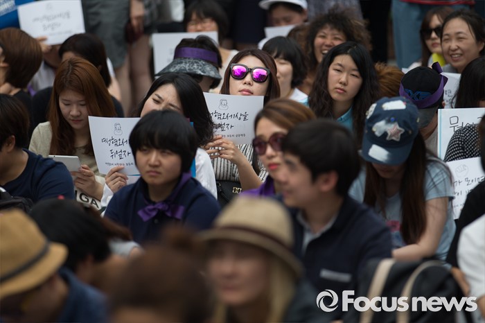 (서울=포커스뉴스) 6일 오후 서울 마포구 나루수산 앞 광장에서 열린 '여성 혐오에 저항하는 모두의 1차 공동행동-여성 혐오세상을 뒤엎자' 집회에 참석한 여성단체 회원이 보라색 안경을 쓰고 여성 혐오 규탄하는 손팻말을 들고 있다.