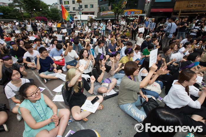 (서울=포커스뉴스) 6일 오후 서울 마포구 나루수산 앞 광장에서 열린 '여성 혐오에 저항하는 모두의 1차 공동행동-여성 혐오세상을 뒤엎자' 집회에 참석한 여성단체 회원들이 여성 혐오를 규탄하는 구호를 외치고 있다.
