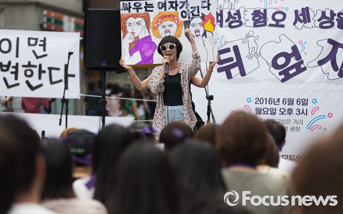 (서울=포커스뉴스) 6일 오후 서울 마포구 나루수산 앞 광장에서 열린 '여성 혐오에 저항하는 모두의 1차 공동행동-여성 혐오세상을 뒤엎자' 집회에 참석한 여성단체 회원이 여성 혐오를 규탄하는 자유발언을 하고 있다.
