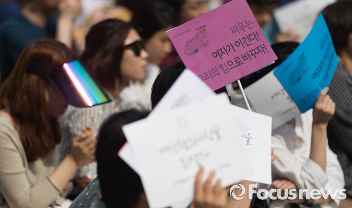 (서울=포커스뉴스) 6일 오후 서울 마포구 나루수산 앞 광장에서 열린 '여성 혐오에 저항하는 모두의 1차 공동행동-여성 혐오세상을 뒤엎자' 집회에 참석한 여성단체 회원들이 여성 혐오를 규탄하는 손팻말을 들고 있다.