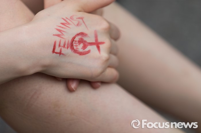 (서울=포커스뉴스) 6일 오후 서울 마포구 나루수산 앞 광장에서 열린 '여성 혐오에 저항하는 모두의 1차 공동행동-여성 혐오세상을 뒤엎자' 집회에 참석한 여성단체 회원이 여성운동가(페미니스트) 페인팅을 하고 있다.