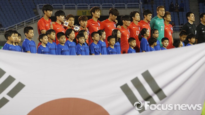 (부천=포커스뉴스) 6일 오후 경기 부천종합운동장에서 열린 2016 4개국 올림픽국가대표 축구대회 대한민국과 덴마크의 경기에서 대한민국 선수들이 태극기를 바라보며 애국가를 제창하고 있다.