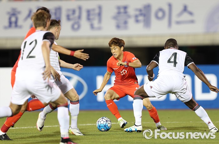 (부천=포커스뉴스) 6일 오후 경기 부천종합운동장에서 열린 2016 4개국 올림픽국가대표 축구대회 대한민국과 덴마크의 경기에서 대한민국 류승우가 상대 선수를 피해 드리블 하고 있다.