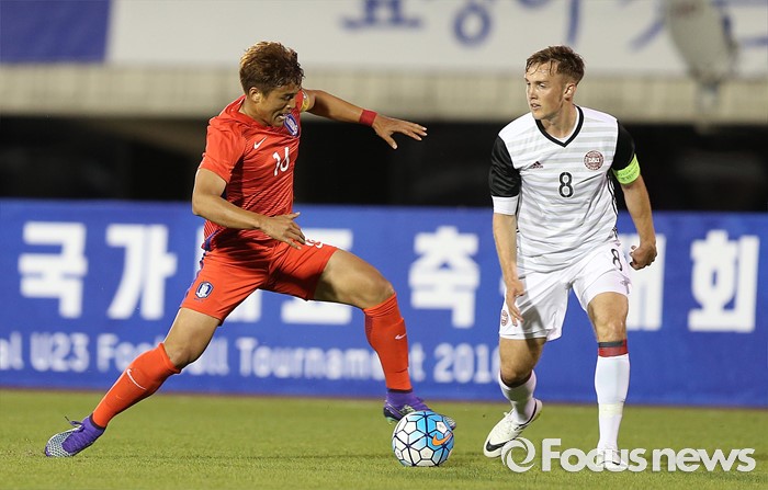 (부천=포커스뉴스) 6일 오후 경기 부천종합운동장에서 열린 2016 4개국 올림픽국가대표 축구대회 대한민국과 덴마크의 경기에서 대한민국 이찬동이 드리블을 하고 있다.