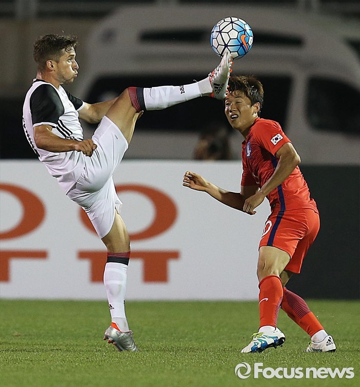 (부천=포커스뉴스) 6일 오후 경기 부천종합운동장에서 열린 2016 4개국 올림픽국가대표 축구대회 대한민국과 덴마크의 경기에서 대한민국 류승우가 상대 선수의 몸짓에 놀라고 있다.