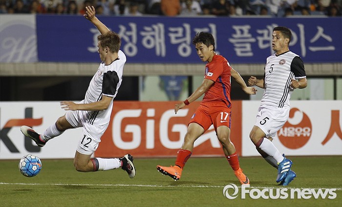 (부천=포커스뉴스) 6일 오후 경기 부천종합운동장에서 열린 2016 4개국 올림픽국가대표 축구대회 대한민국과 덴마크의 경기에서 대한민국 최경록이 슛 하고 있다.