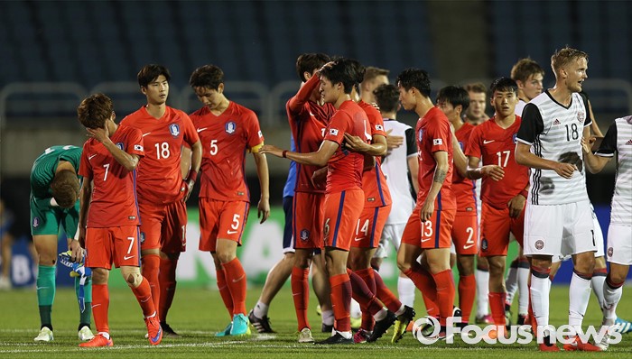 (부천=포커스뉴스) 6일 오후 경기 부천종합운동장에서 열린 2016 4개국 올림픽국가대표 축구대회 대한민국과 덴마크의 경기에서 대한민국 선수들이 경기가 끝난 후 격려하고 있다.