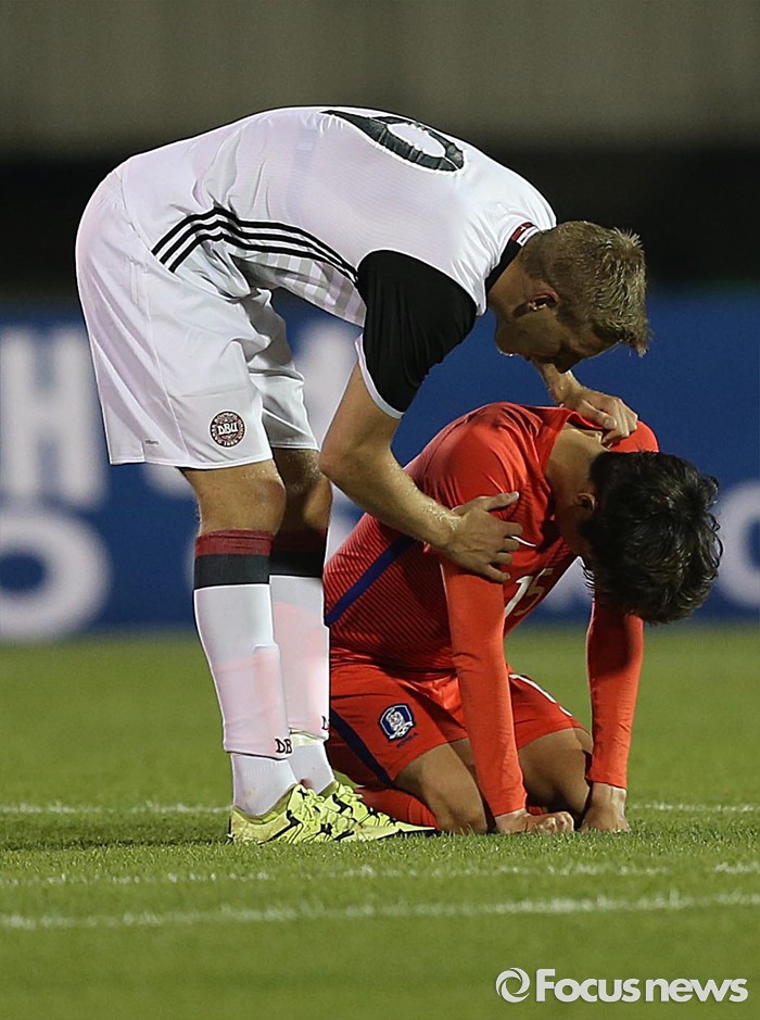 (부천=포커스뉴스) 6일 오후 경기 부천종합운동장에서 열린 2016 4개국 올림픽국가대표 축구대회 대한민국과 덴마크의 경기에서 덴마크 니콜라스 복메슨이 대한민국 최규백을 위로하고 있다.