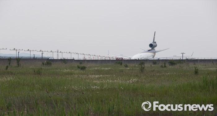 (영종도=포커스뉴스) 7일 오전 인천국제공항 활주로 부근에 UPS 소속 5X61편 화물기가 멈춰서 있다. 인천국제공항과 소방당국에 따르면 지난 6일 오후 10시 48분께 인천공항에서 미국 알래스카 앵커리지로 향할 예정이었던 화물기가 이륙 도중 바퀴가 파손돼 동체 앞 부분이 활주로를 부딪친 채 이동, 이륙에 실패했다고 밝혔다. 사고 직후 화물기에 탑승했던 조종사와 승무원 등 4명 모두 무사히 탈출한 것으로 알려졌다.