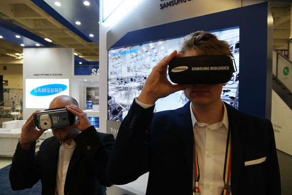 이 행사에는 지난 해 약 1500개 기업이 전시에 참여했으며 약 1만5000여명의 관람객이 방문했다. 올해는 지난 해보다 늘어난 1800여 개 기업이 전시회에 참여하고 있다.2016 BIO 인터내셔널 컨벤션의 삼성바이오로직스 부스에서 바이오 업계 방문객들이 기어VR을 통해 최첨단 설비를 체험하고 있는 모습. <사진출처=삼성바이오로직스>