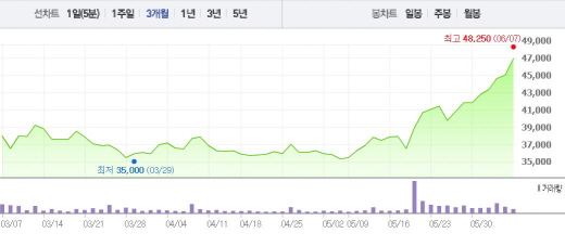 이는 1달 전 주가인 5월4일(3만5300원)과 비교했을 때 32% 상승한 수치다.