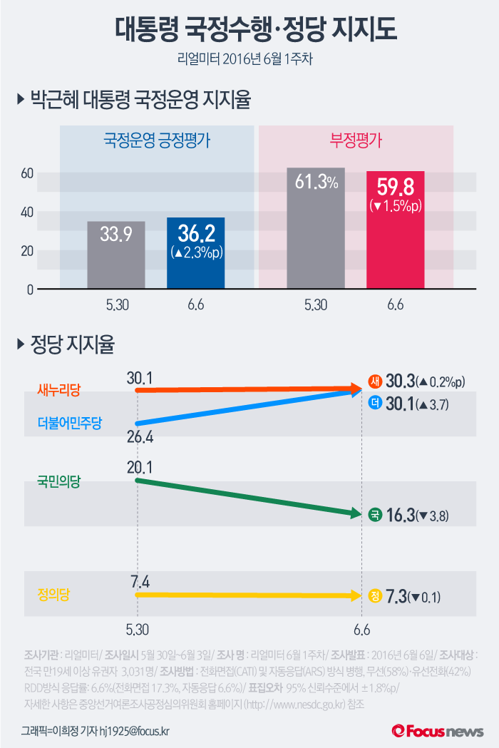 (서울=포커스뉴스) 여론조사 기관 리얼미터의 2016년 6월 1주차 주간집계에 따르면 박근혜 대통령의 국정수행 지지도는 지난 5월 4주차 주간집계 대비 2.3%p 오른 36.2%였다.