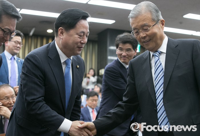 (서울=포커스뉴스) 7일 오전 서울 여의도 국회에서 열린 더불어민주당 의원총회에 참석한 김종인(오른쪽) 비대위 대표와 김두관 의원이 인사하고 있다.