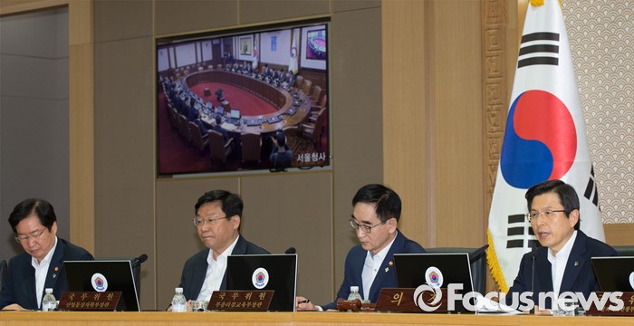 (세종=포커스뉴스) 황교안(오른쪽) 국무총리가 7일 오전 세종시 정부세종청사 국무회의장에서 열린 서울-세종 영상 국무회의에서 모두발언을 하고 있다.