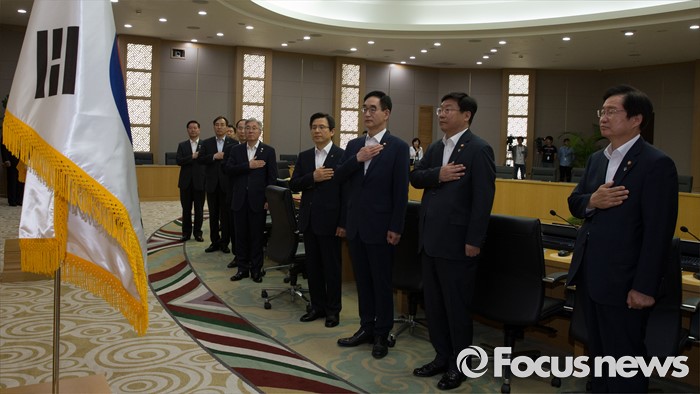 (세종=포커스뉴스) 황교안 국무총리와 국무위원들이 7일 오전 세종시 정부세종청사 국무회의장에서 열린 서울-세종 영상 국무회의에서 국기에 대한 경례를 하고 있다.