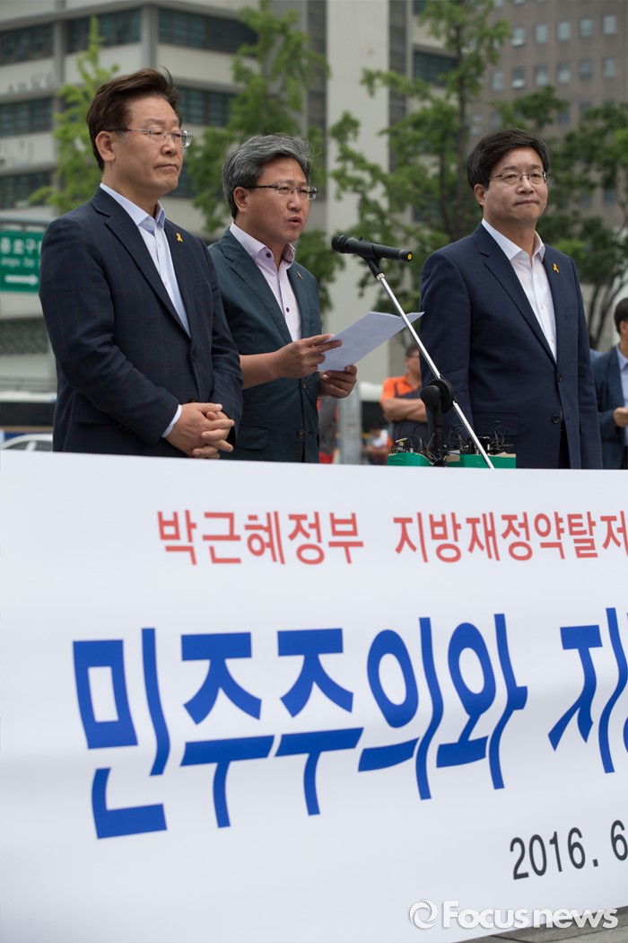 (서울=포커스뉴스) 7일 오전 서울 종로구 광화문광장에서 이재명(왼쪽부터) 성남시장, 채인석 화성시장, 염태영 수원시장이 정부의 지방재정개편안에 반대하는 단식농성 기자회견을 열고 있다.