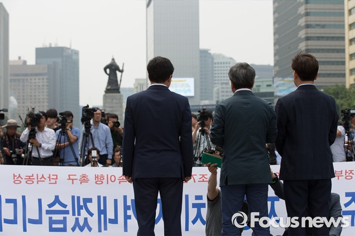 (서울=포커스뉴스) 7일 오전 서울 종로구 광화문광장에서 염태영(왼쪽부터) 수원시장, 채인석 화성시장, 이재명 성남시장이 정부의 지방재정개편안에 반대하는 단식농성 기자회견을 열고 있다.