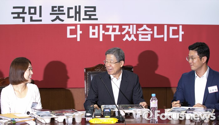 (서울=포커스뉴스) 김희옥(가운데) 새누리당 혁신비대위원장이 7일 오후 서울 여의도 당사에서 청년 사무처 당직자와의 도시락 간담회에 참석해 대화하고 있다.