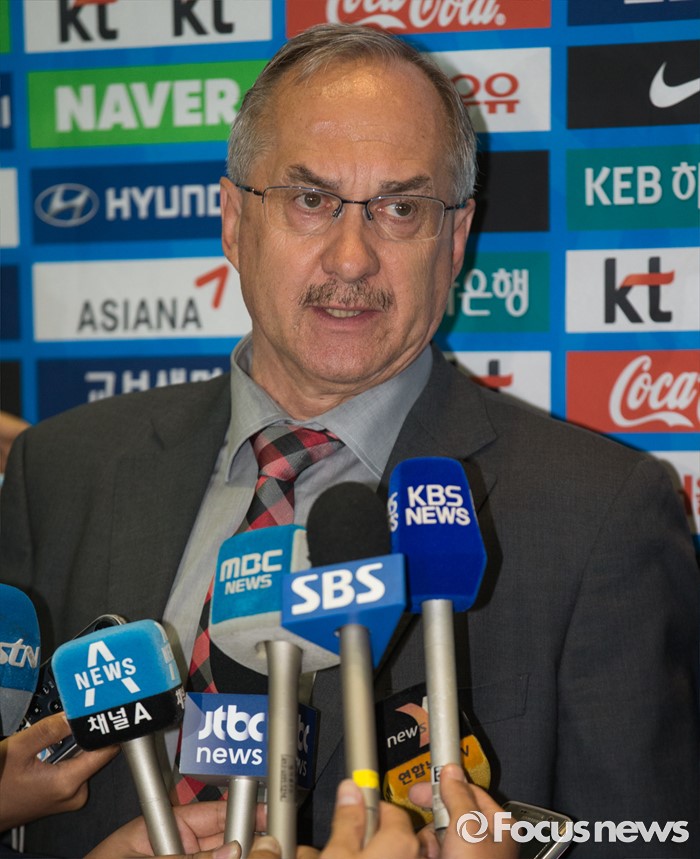 (인천공항=포커스뉴스) 유럽 원정에 나서 두 차례 평가전을 치러 1승 1패(스페인 1-6패, 체코 2-1승)를 거둔 대한민국 축구 국가대표팀 슈틸리케 감독이 7일 오후 인천국제공항을 통해 귀국 후 취재진 질문에 답하고 있다.