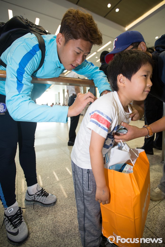 (인천공항=포커스뉴스) 유럽 원정에 나서 두 차례 평가전을 치러 1승 1패(스페인 1-6패, 체코 2-1승)를 거둔 대한민국 축구 국가대표팀 손흥민이 7일 오후 인천국제공항을 통해 귀국 후 어린 팬에게 사인을 해주고 있다.