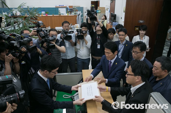 (서울=포커스뉴스) 박주민 더불어민주당 의원과 윤소하 정의당 의원, 전명선 4·16가족협의회 운영위원장, 유경근 집행위원장 등이 7일 오후 서울 여의도 국회 의안과에서 세월호 특별법 개정안 등을 제출하고 있다.