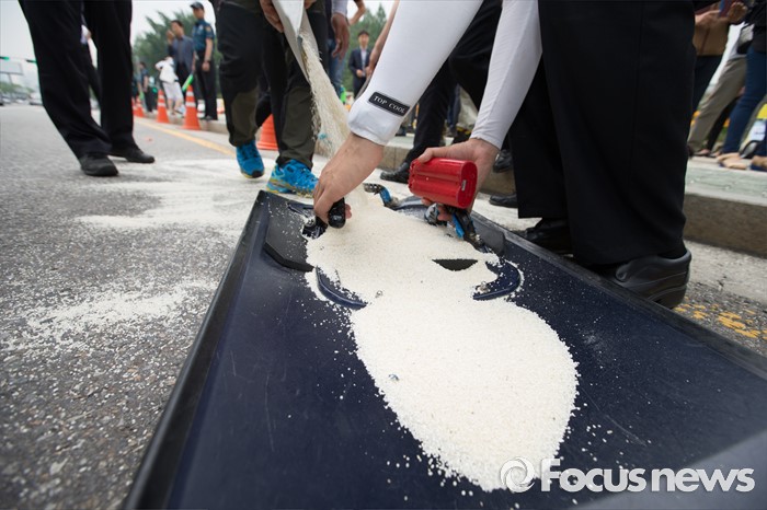 (서울=포커스뉴스) 7일 오후 서울 여의도 국회 정문 앞에서 열린 밥쌀 수입 강행하는 박근혜 정부 규탄 기자회견 시작 전 전국농민회총연맹 회원들이 쌀을 옮기는 과정에서 쌀이 바닥에 쏟아져 경찰들이 방패에 담고 있다.