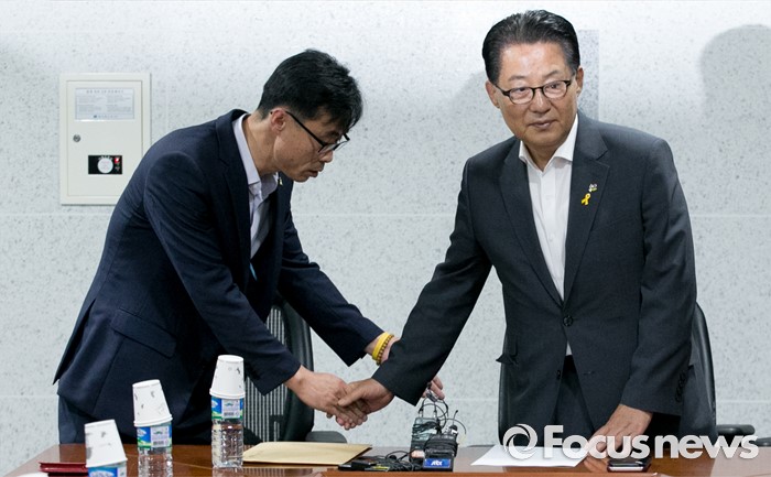 (서울=포커스뉴스) 박지원(오른쪽) 국민의당 원내대표가 7일 오후 서울 여의도 국회 의원회관에서 세월호 특별법 개정안과 관련 전명선 4·16가족협의회 운영위원장 등 관계자들과 면담에 앞서 인사하고 있다.