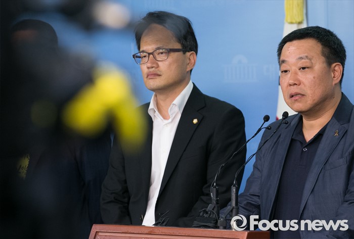 (서울=포커스뉴스) 박주민 더불어민주당 의원과 윤소하 정의당 의원, 전명선 4·16가족협의회 운영위원장, 유경근 집행위원장 등이 7일 오후 서울 여의도 국회 정론관에서 세월호 특별법 개정안 발의 기자회견을 하고 있다.