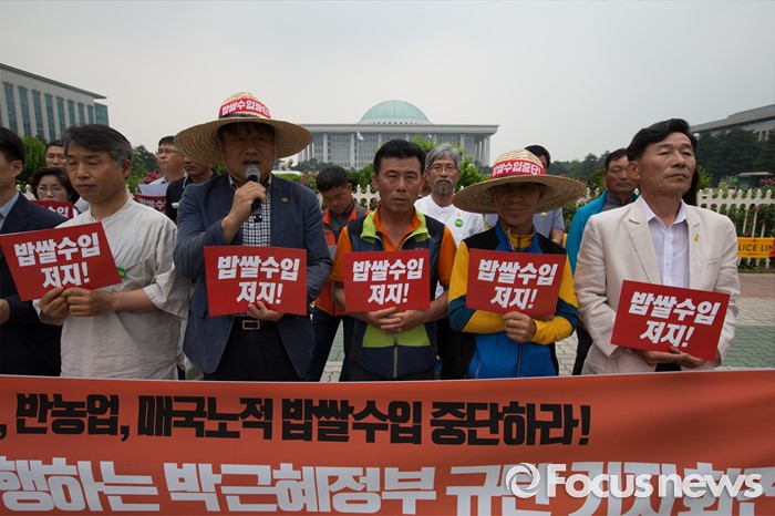 (서울=포커스뉴스) 7일 오후 서울 여의도 국회 정문 앞에서 전국농민회총연맹 회원들이 밥쌀 수입 강행하는 박근혜 정부 규탄 기자회견을 열고 있다.