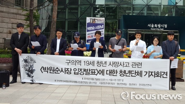 '구의역 19세 청년 추모행동'은 7일 오후 서울 중구 서울시청 앞에서 기자회견을 열고 "서울시가 약속을 어기지 않는지 감시하고, 제대로 된 재발방지 대책이 수립될 때까지 관련 활동을 진행하겠다"고 말했다.