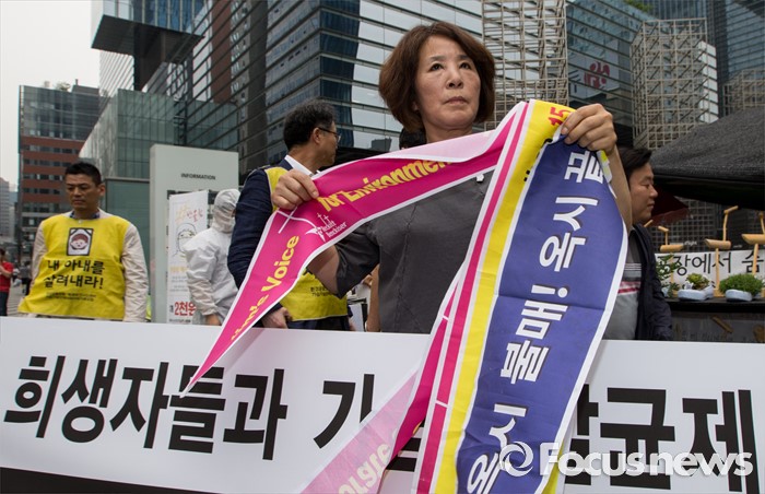 (서울=포커스뉴스) 7일 오후 서울 서초구 삼성전자 사옥 앞에서 열린 '반도체 공장 희생자들과 가습기살균제 피해자들 연대 기자회견'에서 삼성 반도체 피해자의 어머니가 옥시를 규탄하는 현수막을 들고 있다.