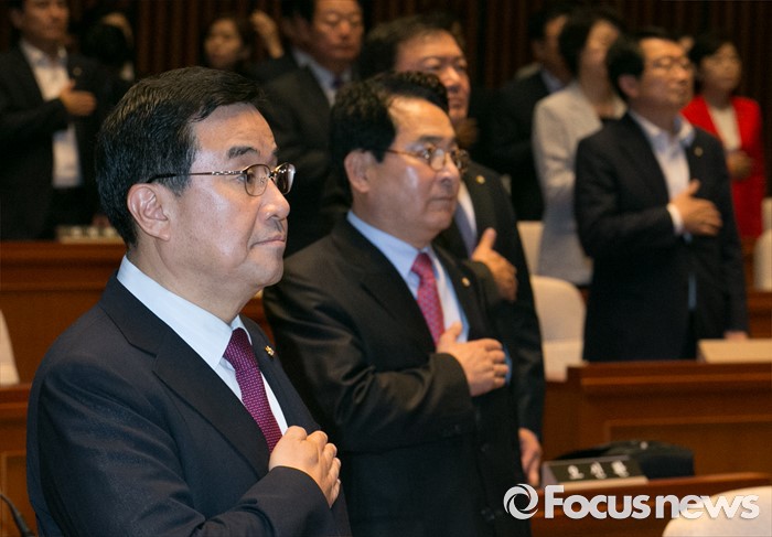 (서울=포커스뉴스) 9일 오전 서울 여의도 국회에서 국회 부의장 후보 선출을 위해 열린 새누리당 의원총회에 국회 부의장 후보자 경선에 참여한 심재철(오른쪽), 김정훈 의원이 참석해 국기에 대한 경례를 하고 있다.