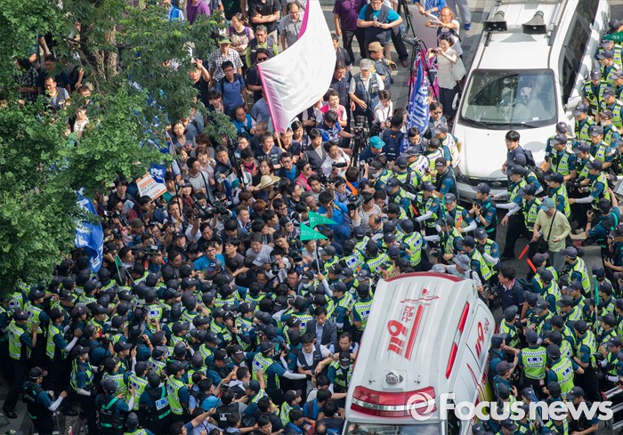 (서울=포커스뉴스) 8일 오후 서울 을지로 옛 국가인권위원회 옥상 광고탑에서 기아자동차 비정규직 노동자의 정규직화를 요구하며 363일 동안 고공농성을 벌인 한규협씨와 최정명씨가 경찰에 의해 구급차로 끌려가자 노조원들이 항의하고 있다.