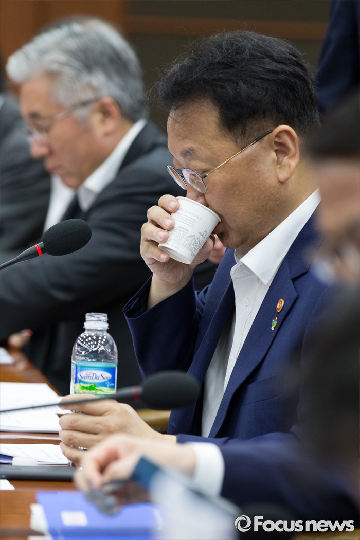 (서울=포커스뉴스) 9일 서울 종로구 정부서울청사에서 열린 제 8차 경제관계장관회의에서 유일호 부총리 겸 기획재정부 장관이 모두 발언을 끝내고 물을 마시고 있다.