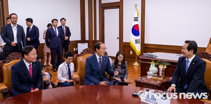 (서울=포커스뉴스) 정세균(오른쪽) 국회의장이 10일 오전 서울 여의도 국회에서 이원종(가운데) 대통령비서실장, 김재원 청와대 정무수석과 면담 하고 있다.