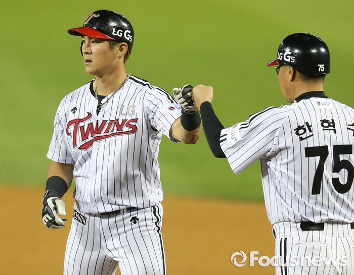 (서울=포커스뉴스) 7일 서울 잠실구장에서 열린 2016 프로야구 삼성-LG 경기 8회말 2사 만루에서 LG 오지환이 2타점 중전 안타를 치고 1루에서 한혁수 코치의 축하를 받고 있다.