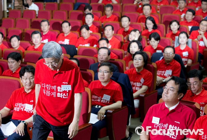 (과천=포커스뉴스) 10일 오전 경기도 과천 국가공무원인재개발원에서 열린 2016 새누리당 정책워크숍에 참석한 김희옥(왼쪽) 혁신비대위원장이 인사말을 위해 단상으로 향하고 있다.