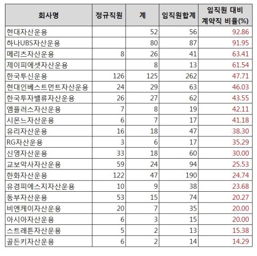 뒤를 이어 41명 중 26명이 계약직인 메리츠자산운용(63.4%), 13명 중 8명이 계약직인 제이피에셋자산운용(61.53%), 262명 중 125명이 계약직인 한국투신운용(47.70%)이 3~5위 자리에 올랐다.