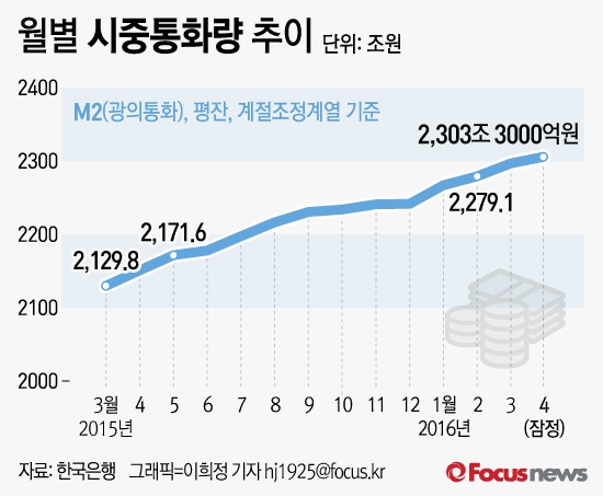 (서울=포커스뉴스) 한국은행이 8일 공개한 ‘2016년 4월 중 통화 및 유동성 동향’에 따르면 4월 시중통화량(M2·광의통화)은 전년 동월 대비 7.0%, 전월 대비 0.4% 증가한 2303조3000억원(계절조정·평잔)으로 집계됐다.
