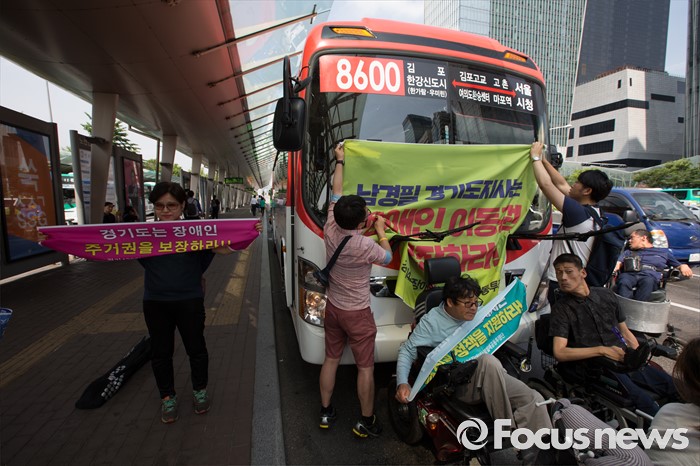 (서울=포커스뉴스) 8일 오후 서울 영등포구 여의도 환승센터 앞에서 경기장애인차별철폐공동투쟁단원들이 장애인 이동권 보장을 촉구하며 경기도행 버스를 막아서고 구호를 외치고 있다.