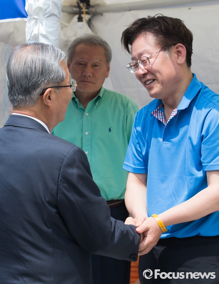 (서울=포커스뉴스) 김종인(왼쪽) 더불어민주당 비상대책위원회 대표가 8일 오후 서울 광화문광장에서 지방재정제도 개편을 반대하며 무기한 단식농성 중인 이재명 성남시장을 만나 악수하고 있다.