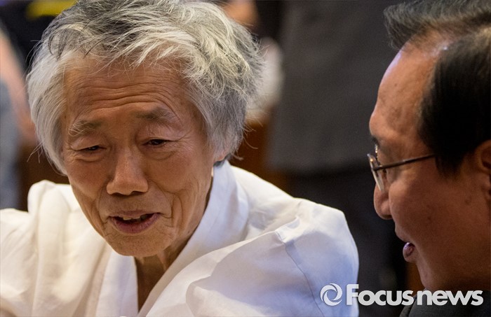 (서울=포커스뉴스) 10일 오전 서울 중구 정동 대한성공회 서울주교좌성당에서 열린 6월항쟁 29주년 기념식에 참석한 백기완(왼쪽) 통일문제연구소장과 노회찬 정의당 원내대표가 대화하고 있다.