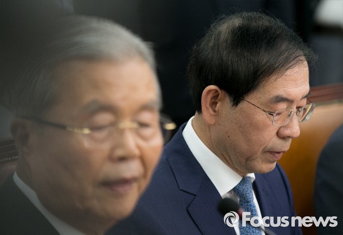 (서울=포커스뉴스) 8일 오전 서울 여의도 국회에서 구의역 스크린도어 노동자 사망 사건과 관련해 열린 더불어민주당-서울시 정책간담회에 참석한 박원순(오른쪽) 서울시장이 김종인 비대위 대표의 발언을 듣고 있다.