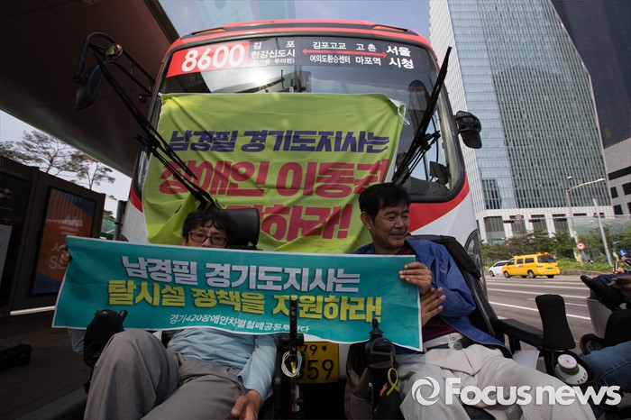(서울=포커스뉴스) 8일 오후 서울 영등포구 여의도 환승센터 앞에서 경기장애인차별철폐공동투쟁단원들이 장애인 이동권 보장을 촉구하며 경기도행 버스를 막아서고 구호를 외치고 있다.