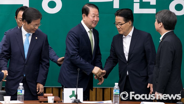 (서울=포커스뉴스) 9일 오전 서울 여의도 국회에서 국회 부의장 후보 선출을 위해 열린 국민의당 의원총회에 참석한 지도부가 박주선 의원을 축하해주고 있다. 왼쪽부터 천정배 공동대표, 박 의원, 박지원 원내대표, 안철수 상임공동대표. 이날 국민의당은 국회 부의장 후보로 박주선 의원을 선출했다.