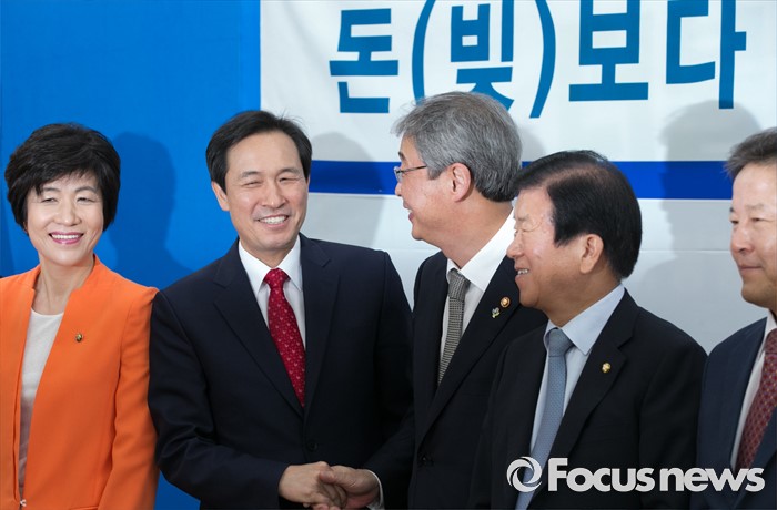 (서울=포커스뉴스) 9일 오전 서울 여의도 국회에서 열린 더불어민주당 가계부채TF, 현황 및 정부대책 보고에 참석한 우상호 원내대표와 임종룡 금융위원장 등 의원들이 포즈를 취하고 있다. 왼쪽부터 김영주 TF 위원장, 우 원내대표, 임 위원장, 박병석, 정재호 의원.