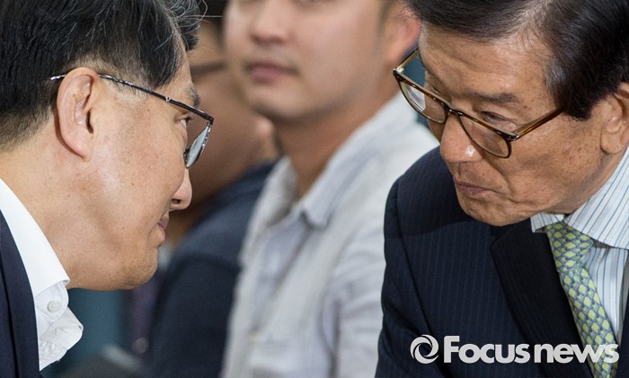 (서울=포커스뉴스) 8일 오전 서울 종로구 정부서울청사에서 열린 구조조정 관계장관회의에 참석한 진웅섭 금융감독원장(왼쪽)과 이동걸 산업은행장이 인사하고 있다.