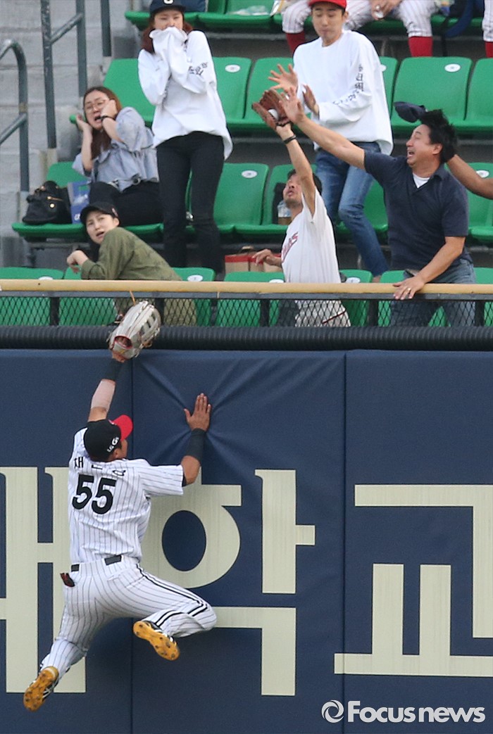 (서울=포커스뉴스) 8일 서울 잠실구장에서 열린 2016 프로야구 삼성-LG 경기 2회초, LG 우익수 채은성이 삼성 선두타자 최형우의 홈런 타구를 향해 펜스를 뛰어 오르고 있다. 타구는 관중석 팬의 글러브 속으로 빨려 들어갔다.